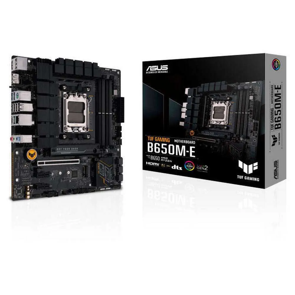A Asus TUF Gaming B650M-E é uma placa-mãe que incorpora esteticamente elementos de design geométricos e pretos escuros para refletir a confiabilidade e estabilidade que definem a série TUF GAMING.